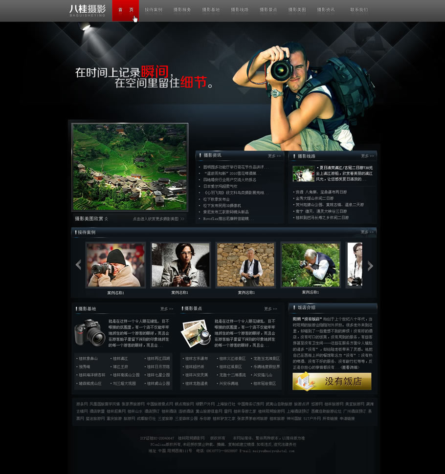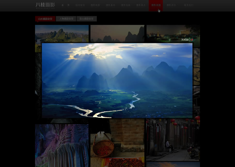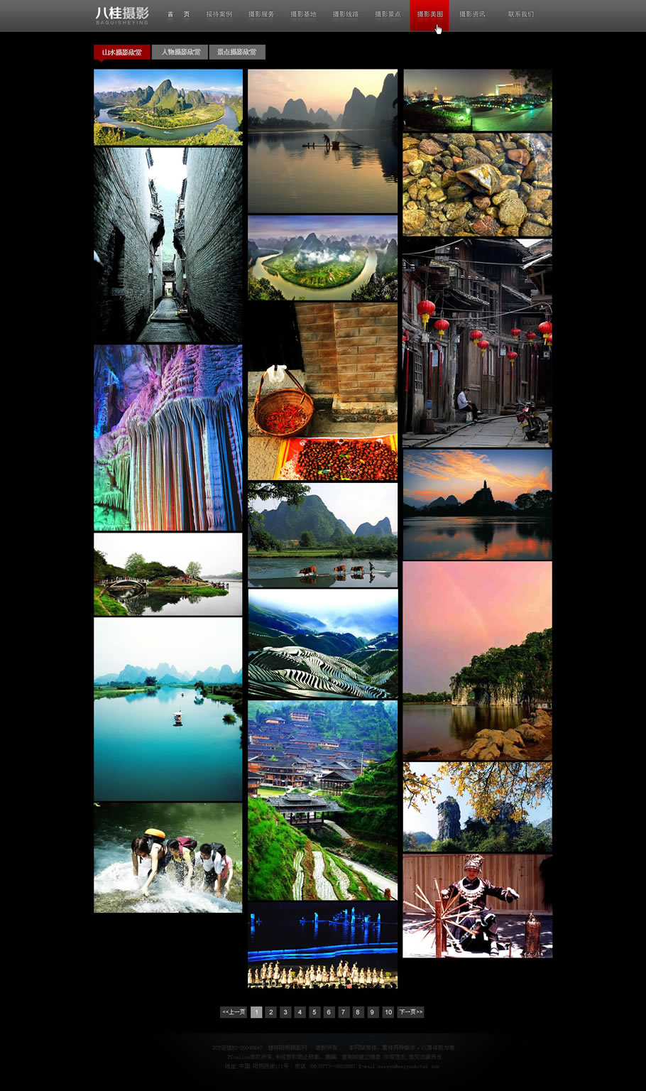特点:八桂摄影提供旅游摄影,旅游随拍,自由行自助游等服务为主,为广大驴友提供旅游摄影服务。网站设计我们以深色为主,图片采用瀑布流的方式展示,整体比较华丽大气。