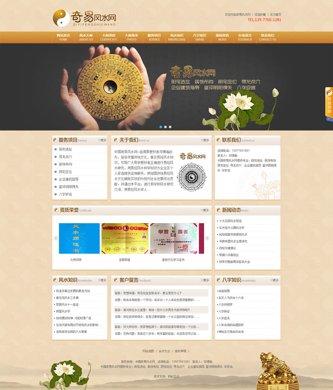 蚂蚁互动签约奇易风水网,为其提供网站建设及空间域名服务。网站整个以土黄的深综色为主,切合以佛教信念背景的色彩,导航用中英语结合,具体有国际化的特色,大图做一个大的八封盘渲染一种神秘色彩,给网站有画龙点睛之作用。此网站在桂林网站建设中风水行业中属最为专业有特色一个。