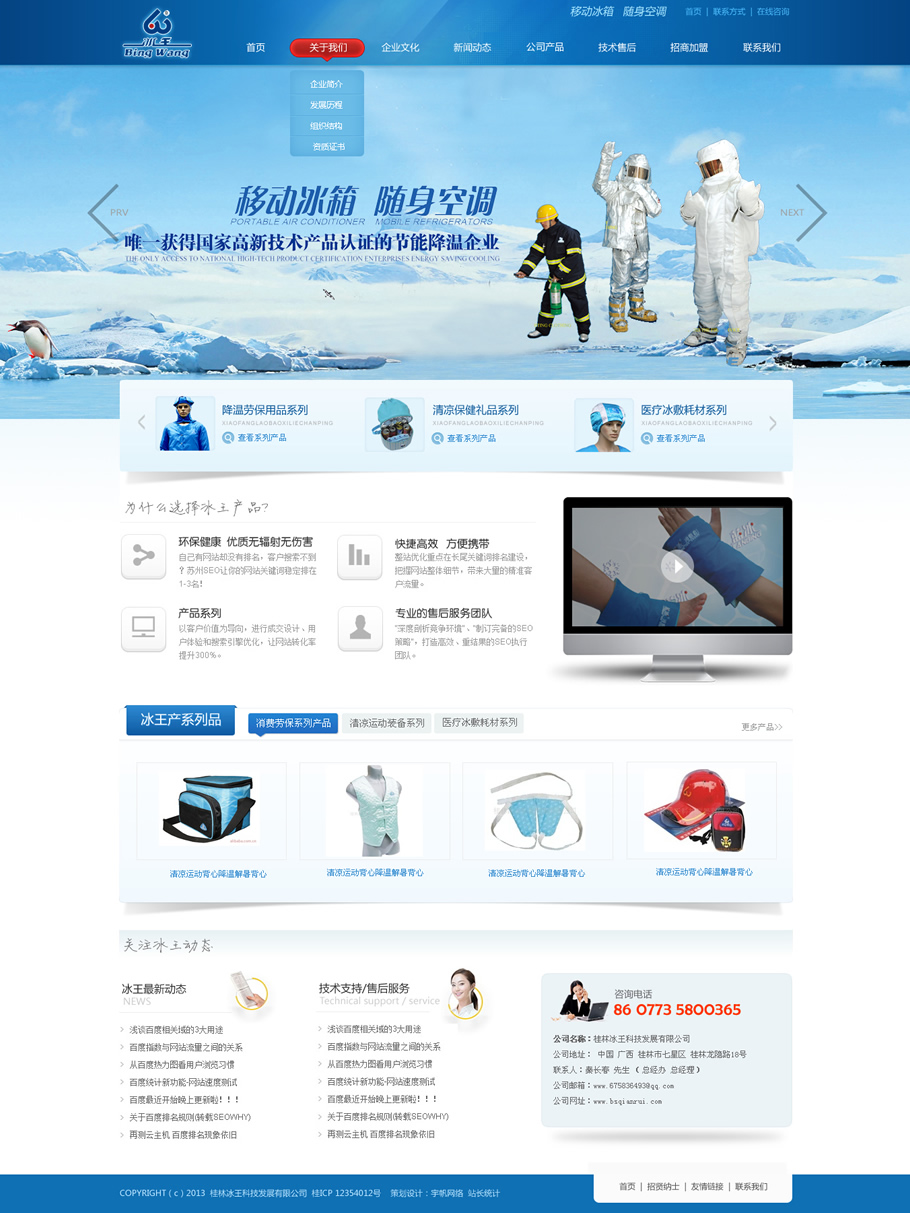特点:桂林冰王科技发展有限公司,其前身为桂林市天使保健用品厂,创建于1989年,是一家拥有中国自主知识产权,专业研发“蓝冰”高分子蓄能环保降温材料及节能降温技术的高新技术企业,企业通过ISO9001:2000质量管理体系认证。创始人暨总经理秦长春先生先后获得四十几项国家专利及世界优秀专利技术,荣获“世纪专家”荣誉称号;企业主要开发生产“清凉保健礼品”、“医疗冰敷耗材”、“降温劳保用品”等三大系列蓝冰专利产品。其蓝冰系列产品荣获了首届中国医疗保健精品博览会银奖、首届中国国际保健美容名优新产品奖、中华国产精品认证书等多种荣誉奖项;其医疗冰敷耗材在国内已有近20年的市场;在环保节能、清凉降温领域,蓝冰技术一直处于国际领先的地位。