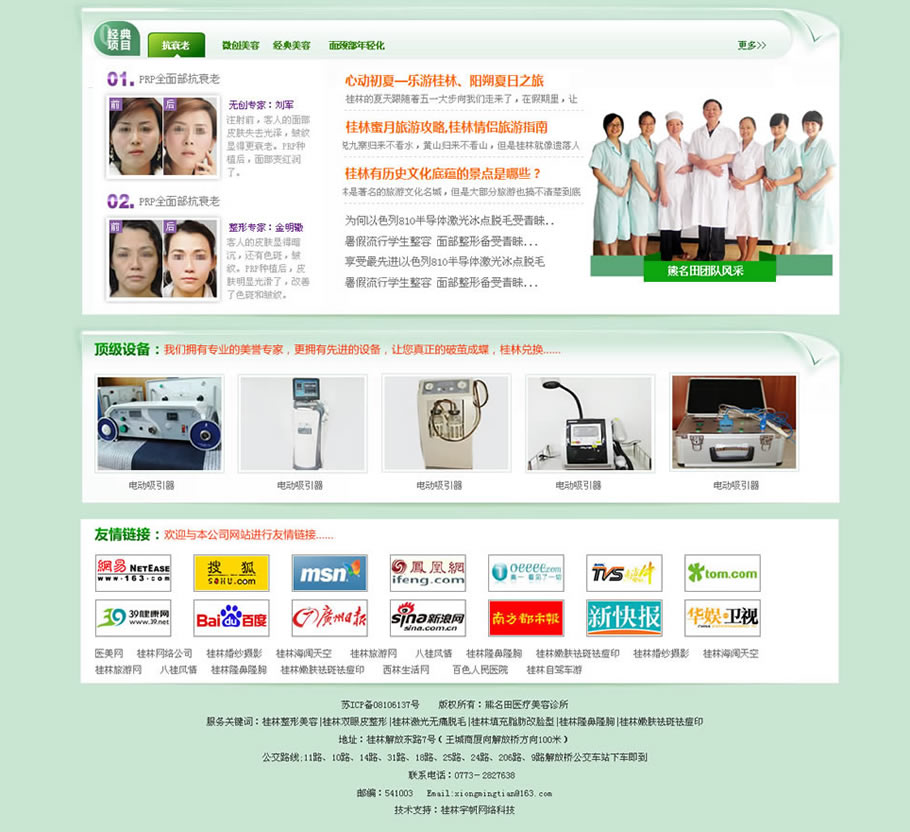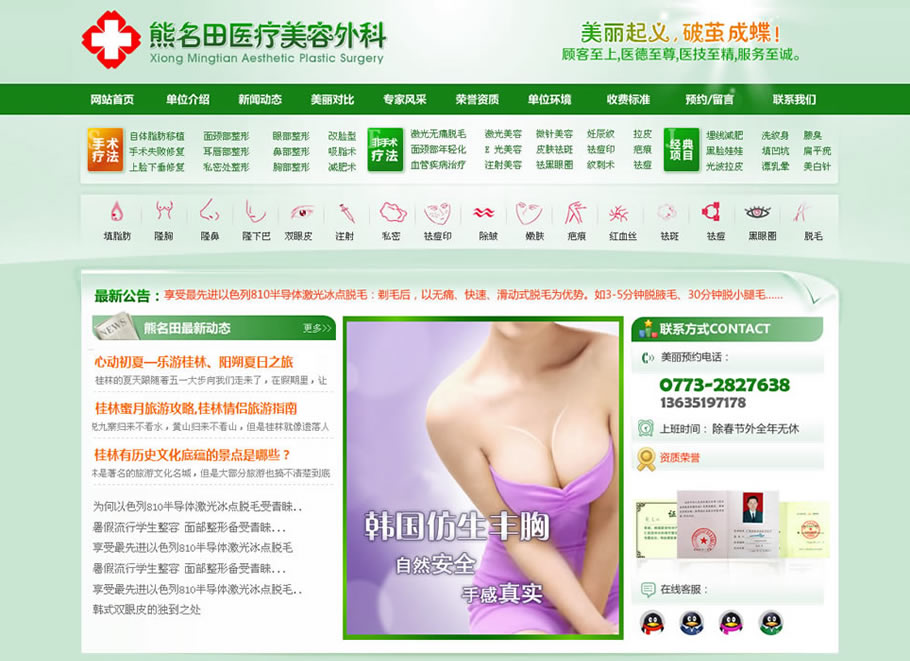 特点:熊名田医疗美容: 是经国家卫生部门审核批准的正规医疗机构,2008年8月成立,座落于风景秀丽的山水之城――广西桂林市解放东路7号1-3楼( 王城商厦往解放桥方向100米), 内设咨询室、小药房、激光脱毛室、激光美肤室、高智能E光、射频(RF)嫩肤祛斑室、整形换药室、主任办公室、整形手术室、处置室、观察室等。